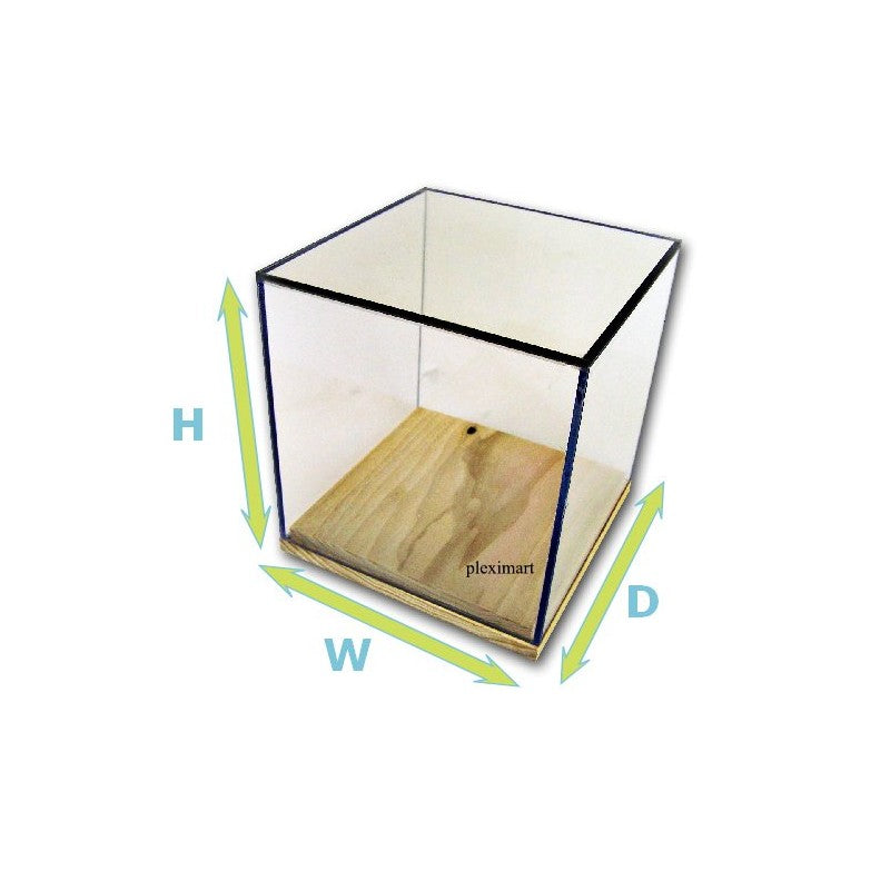 Clear acrylic display box 1/8" thick with wood base. (MDF) Polished edges - exterior dimension.